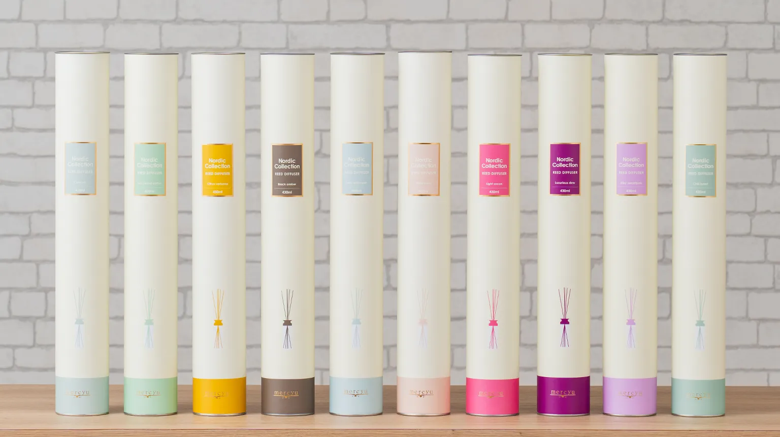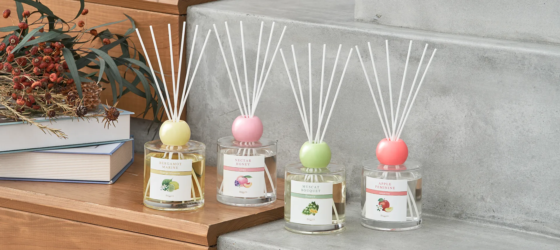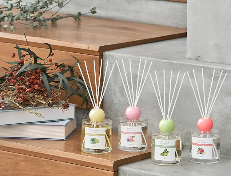 ジューシーな果実に繊細な花々や清涼感を重ねた香り。日常にそっと寄り添いながらも上品で華やかにお部屋を彩るコレクション。