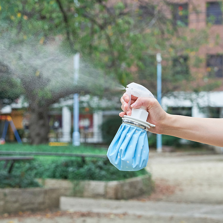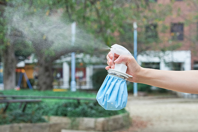 猛暑でほてった肌には氷のうで直接冷却し、体の広範囲で爽快感を得たい時は、氷水スプレーを浴びて瞬間リフレッシュ。