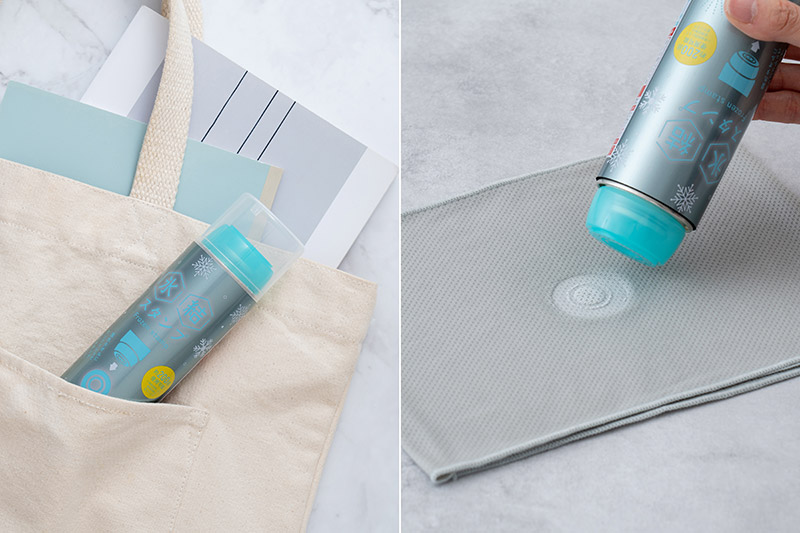スタンプ式の使用は水で濡らした箇所を氷結して氷タオルに。スプレー式の使用は広範囲を一気に冷却してクールダウン。用途に応じて使い分けできます。