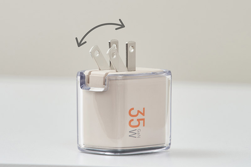折りたたみ式のスイングプラグを採用し、持ち運び時にプラグや他の荷物を傷つけにくくします。