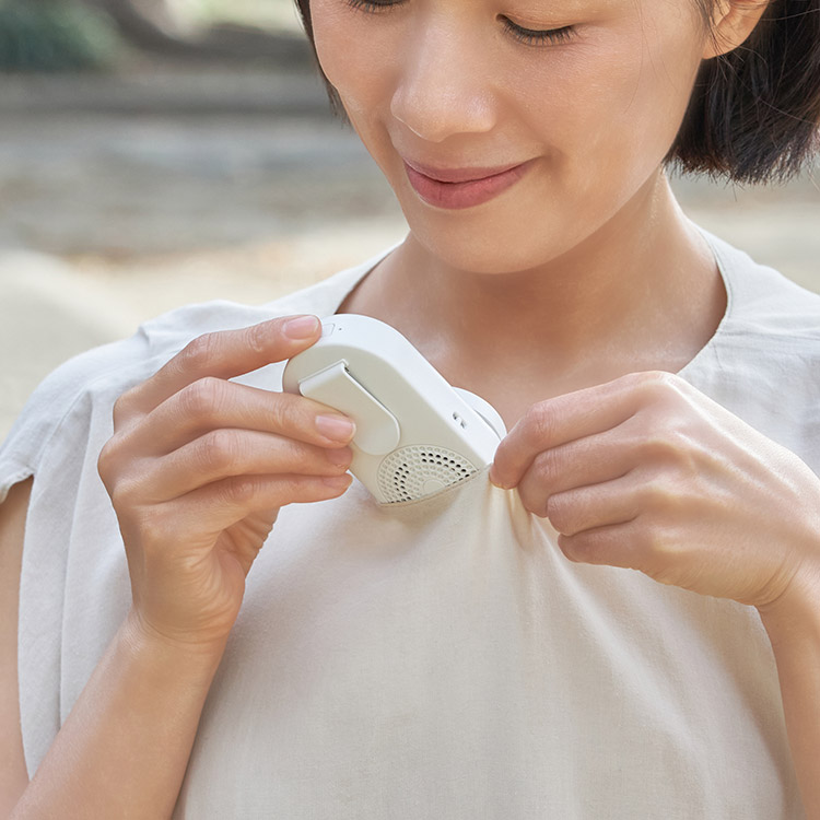 クリップで襟元に挟むだけ。Tシャツや襟付きシャツ、タンクトップなど、洋服のデザインを選ばず使えます。