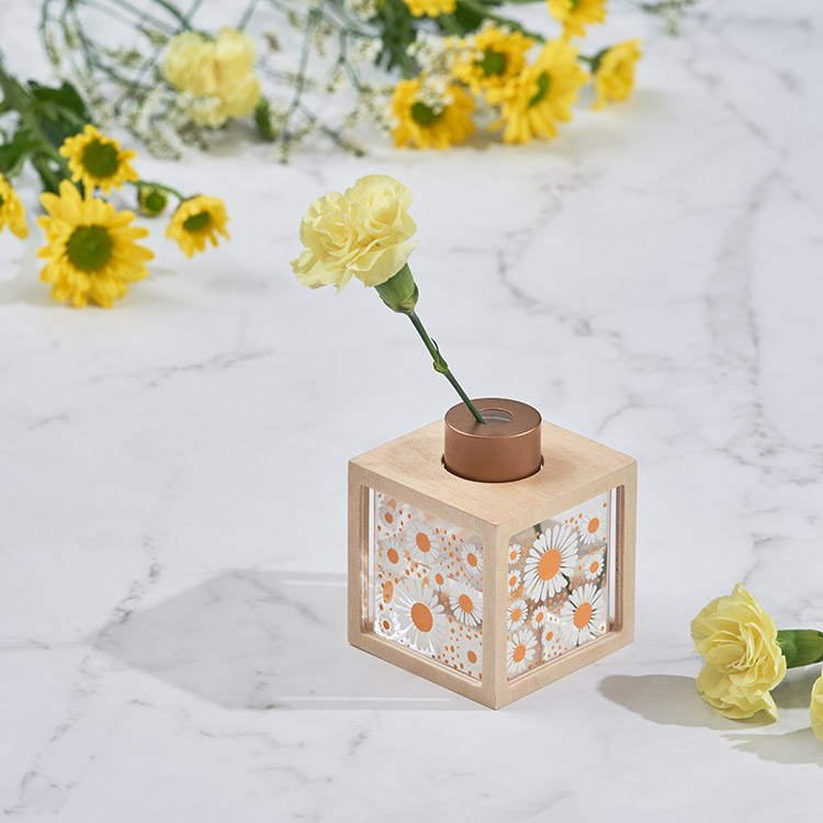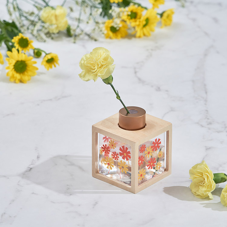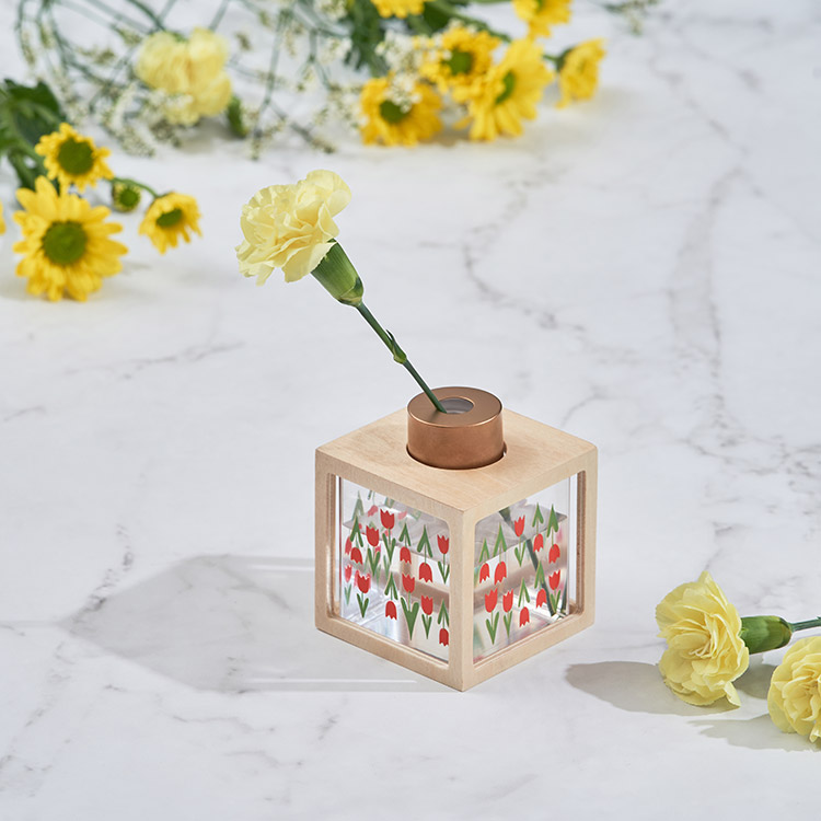 ナチュラルなウッドフレームから花々が覗くキュートなデザインで、3方向から花モチーフを楽しめます。ボトルの裏側に配置した隠れロゴの遊び心も◎。
