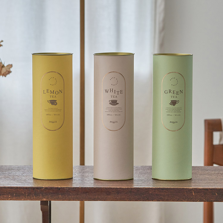 お茶の芳香がお部屋に広がり、ティータイム気分を味わえるリードディフューザー。香りは草の露を思わせる穏やかな「グリーンティー」、レモンとセイロンの爽やかな「レモンティー」、華やかな白茶をベースにした「ホワイトティー」と、テイストの異なる3種をお楽しみいただけます。ラベルやパッケージは、紅茶缶をイメージしたシックな仕上がりで、置くだけでお部屋のアクセントに。香りもデザインもユニセックスである点も魅力。