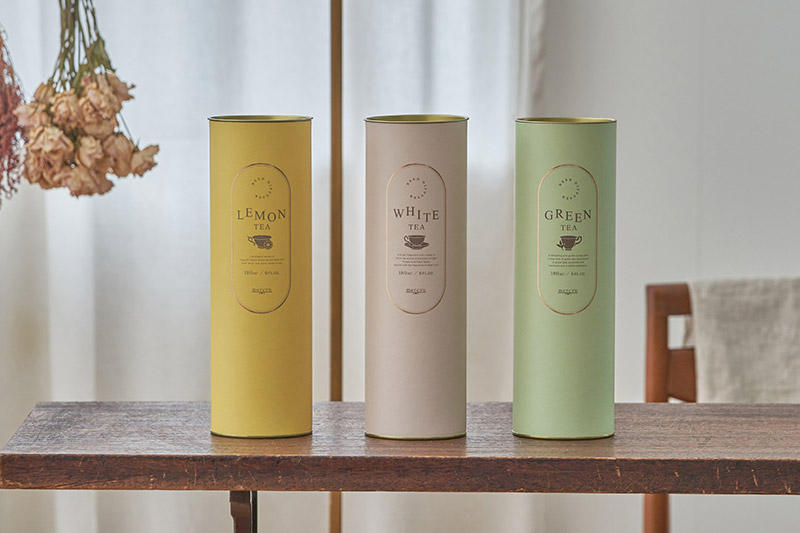 ティータイムからイメージされた円筒型のパッケージは、ギフトにも喜ばれそうな目を惹くデザイン。ユニセックスで手に取りやすい仕上がりに。