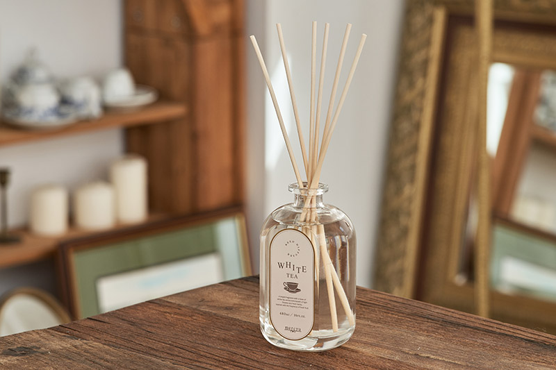 心地よいお茶の芳香がお部屋に広がり、ティータイム気分を味わえるリードディフューザー。香りは草の露を思わせる穏やかな「グリーンティー」、レモンとセイロンの爽やかな「レモンティー」、華やかな白茶をベースにした「ホワイトティー」と、テイストの異なる3種をお楽しみいただけます。ラベルやパッケージは、紅茶缶をイメージしたシックな仕上がりで、置くだけでお部屋のアクセントに。香りもデザインもユニセックスである点も魅力。