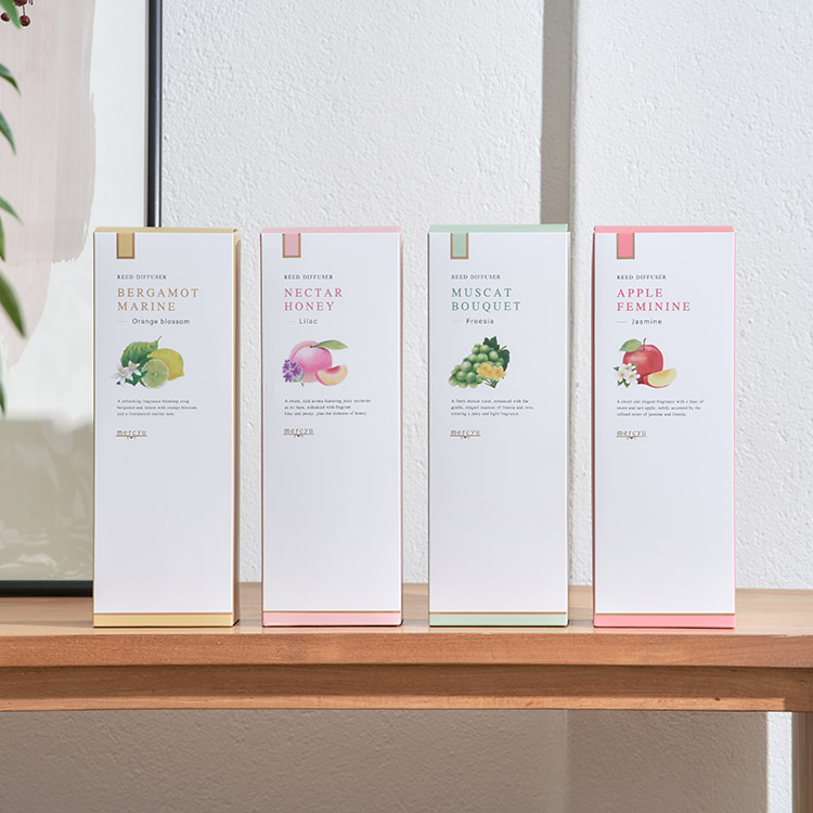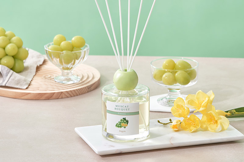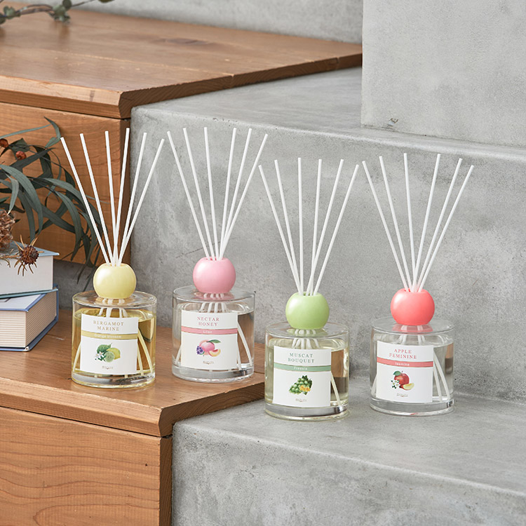 果実のジューシーさをベースに様々な花の香りを掛け合わせ、甘いながらも華やかで上品な香りを楽しめるリードディフューザー。それぞれのフルーツの香りに寄り添うフローラル香の組み合わせで、果実味を感じながらも奥行きのある仕上がりに。置くだけでお部屋の印象が変わるような、みずみずしい香りを届けます。フルーツのフォルムからインスパイアされたボトルデザインは、コロンと丸い形のキャップがキュートでギフトにもおすすめです。