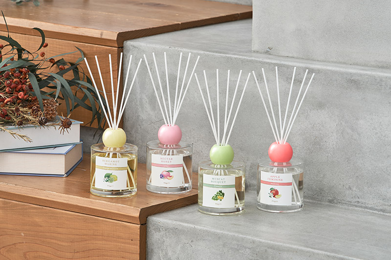 フレグランスボトルは、フルーツを彷彿する、コロンと丸いフォルムを採用。円柱形のボトルに合わせた丸いキャップが、お部屋をキュートな印象に。